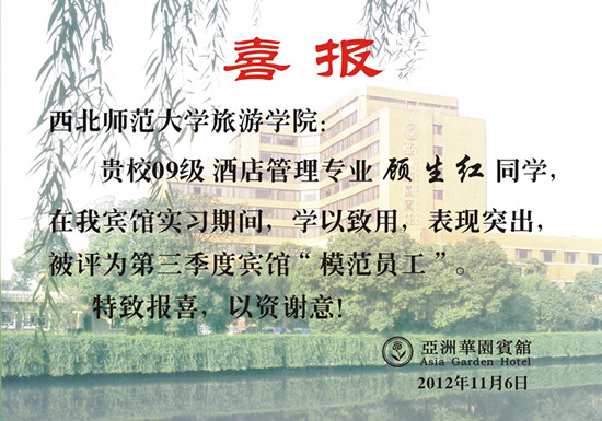 必赢官网2009级的同学已顺利结束了在宁波亚洲华园宾馆的实习。酒店管理2班顾生红同学在实习期间,热爱本职工作,勤奋好学,善于思考,兢兢业业,在师傅及同事、领导的帮助和指导下,很快的掌握了前台接待的业务知识,独立上岗后更是积极主动,自我加压,使自身的工作能力和业务素质很快得到提高,得到了良好锻炼,由于表现突出,被评为亚洲华园宾馆第三季度“模范员工”,在此向顾生红同学表示祝贺,希望广大实习生向她学习,在平凡的实习岗位上充分展示自己的风采,为大学生活留下精彩的回忆。