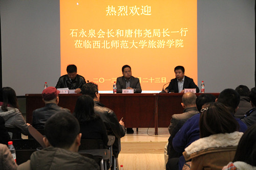11月23日上午,永尚旅游产业机构董事长、重庆甘肃商会会长石永泉到学院作了题为“旅游地产与城市价值”的专题报告会。兰州市旅游局党组书记、局长唐伟尧,学院院长把多勋、副院长梁旺兵出席报告会。兰州市旅游局机关各处室领导干部,兰州市部分县区旅游局长,兰州市旅游协会、市属旅游骨干企业、园林企业负责人,437必赢会员中心部分教师和研究生共100余人参加了报告会。
