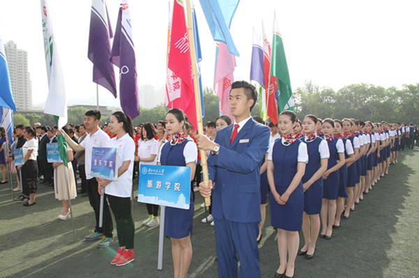 在5月13日上午的入场仪式上,必赢官网全体教工和2014级音乐表演(空中乘务方向)96名本科生组成的方队在党委书记贾志斌、院长把多勋的带领下,昂首阔步,英姿飒爽的走过主席台,整齐划一的方队赢得了在场观众的阵阵掌声。
