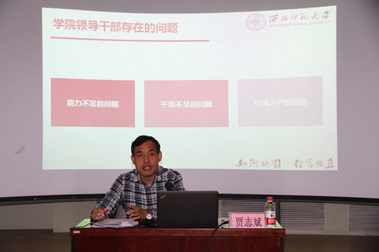 贾书记分析了学院在当下面临的重大发展机遇和挑战,列举了学院领导班子和师生党员中存在的问题,要求学院全体党员领导干部及教职工党员在全面促进学院内涵建设和服务于国家“一带一路”建设、甘肃华夏文明传承创新区建设、甘肃省文化大省建设以及文化与旅游融合发展等国家和我省重大战略中发挥重要作用。