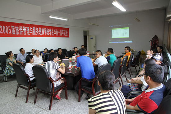 7月31日,必赢官网首届本科毕业班—2005届旅游管理与服务教育甲班学生返校庆祝毕业十周年。当日下午与老师们进行了座谈交流,甲班学生、学院领导和任课教师30余人参加了座谈会。座谈会由贺发流同学主持。