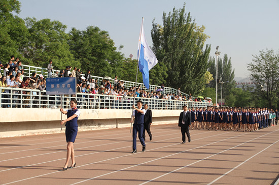 在5月11日上午的入场仪式上,必赢官网全体教工和2015级音乐表演(空中乘务方向)80名本科生组成的方队在党委书记贾志斌、院长把多勋的带领下,昂首阔步,英姿飒爽的走过主席台,整齐划一的方队赢得了在场观众的阵阵掌声。
