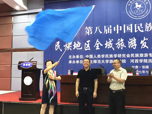 437必赢会员中心副院长王耀斌副教授代表第八届中国民族旅游论坛承办方向第九届承办方云南大学工商与旅游管理学院院长吕婉青教授移交会旗