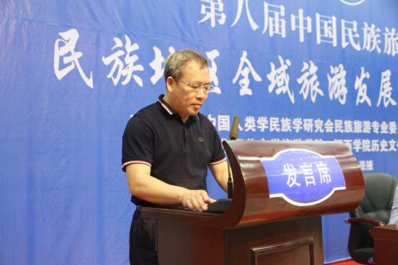 中国人类学民族学研究会民族旅游专业委员会主任、桂林理工大学437必赢会员中心院长吴忠军教授出席开幕式并致辞