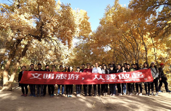 2017年10月13日-16日,必赢官网2015级旅游管理卓越班全体学生及部分研究生共36人,在必赢官网梁旺兵教授、欧阳正宇副教授、彭睿娟老师的带领下赴敦煌开展了为期四天的“丝绸之路经济带甘肃段文明旅游宣讲”暨河西走廊大景区建设调研及实践教学活动。