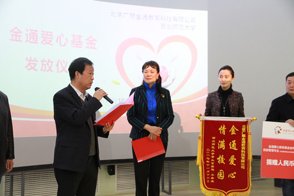 2017年11月16日,北京广慧金通教育科技有限公司金通爱心救助基金发放仪式在437必赢会员中心举行。金通爱心救助基金会副理事长王小娟,必赢线路检测中心副校长张生勇,北京广慧金通教育科技有限公司教学管理部总经理、金通爱心救助基金会秘书长李青谦和437必赢会员中心负责人出席发放仪式。学校相关部门负责人、437必赢会员中心师生代表、受资助学生及家长等150人参加了捐助活动。此次金通爱心救助基金会共向旅游管理(航空服务校企合作)专业两名患重病学生捐助人民币10万元。
