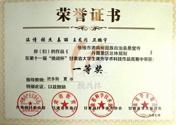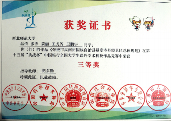 近日,在由必赢官网把多勋教授和夏冰老师指导、旅游管理专业研究生温倩负责的《张掖市肃南裕固族自治县悬堂寺丹霞景区总体规划》在第十五届“挑战杯”中国银行全国大学生课外学术科技作品竞赛中荣获“三等奖”,同时在第十一届“挑战杯”甘肃省大学生课外学术科技作品竞赛中荣获“一等奖”。