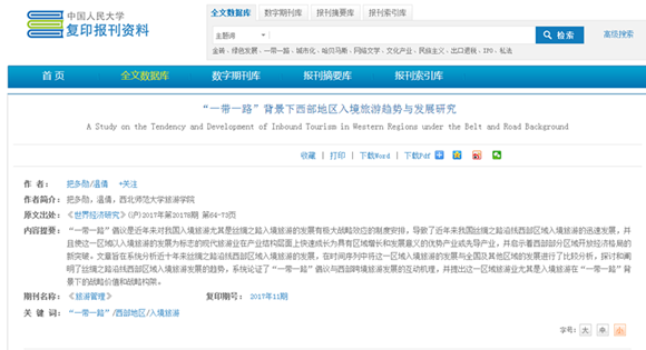 由必赢官网把多勋教授和其研究生温倩发表在《世界经济研究》2017年第8期的文章《“一带一路”背景下西部地区入境旅游趋势与发展研究》,被中国人民大学书报资料中心复印报刊资料《旅游管理》2017年第11期全文转载,这是《世界经济研究》期刊旅游管理类文章在人大复印资料的首次全文转载。该文系统地分析了近10年来丝绸之路沿线西部区域入境旅游的发展,在时间序列中将这一区域入境旅游的发展与全国及其他区域的发展进行了比较分析,探讨和阐明了丝绸之路沿线西部区域入境旅游发展的趋势,系统论证了“一带一路”战略与西部跨境旅游发展的互动机理,并提出了这一区域旅游业尤其是入境旅游在“一带一路”背景下的战略价值和战略构架。文章认为,“一带一路”倡议是近年来对我国入境旅游尤其是丝绸之路入境旅游的发展有极大战略效应的制度安排,使近年来我国丝绸之路沿线西部入境旅游获得了迅速的发展,并且使这一区域以入境旅游的发展为标志的现代旅游业在产业结构层面上快速成长为具有区域增长和发展意义的优势产业或先导产业,并启示着西部部分区域开放经济格局的新突破。