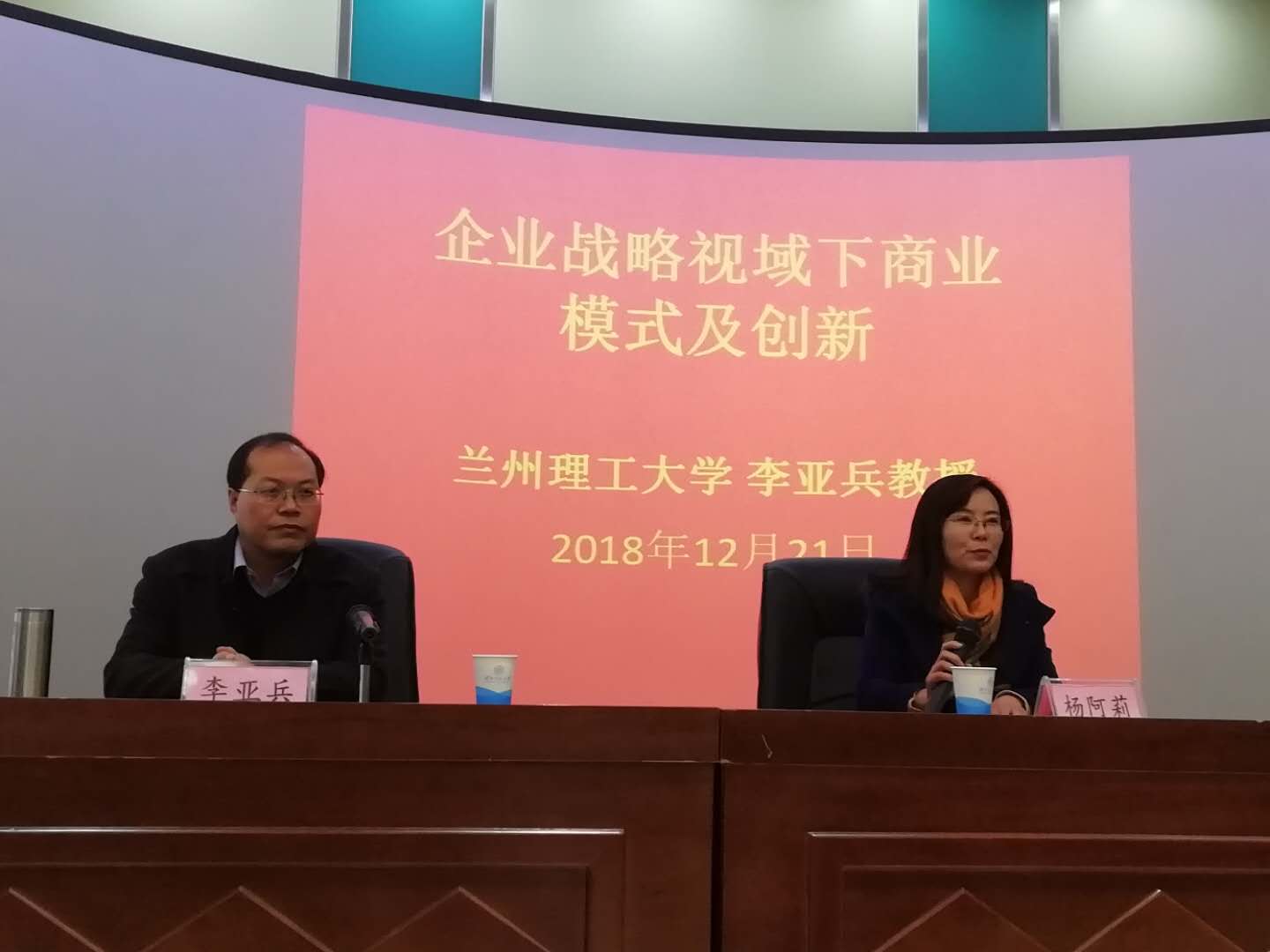12月21日上午,学院邀请兰州理工大学经济管理学院副院长李亚兵教授在学院楼七楼报告厅为学院师生作了题为 《企业战略视域下商业模式及设计》的学术报告,学院研究生、本科生及教师120余人聆听了报告。报告会由学院杨阿莉教授主持。