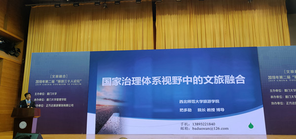 本届“旅游三十人论坛”共有近20名业界大咖云集厦门。其中有来自国内一流高校的吴必虎、谢彦君、张广瑞、向勇、刘静艳、沈涵、林璧属、林德荣等知名教授,带来了北京大学、复旦大学、厦门大学、中山大学、山东大学、海南大学等不同地域高校以及中国科学院旅游研究中心等研究机构的不同学术风格。同时也请来了华高莱斯董事长李忠、唐人智库首席专家张晓军等业界人士,带来了行业一线的独特见解。必赢官网院长把多勋教授受邀带领学院5位老师参加了该论坛,并做了题为《国家治理体系视野下的文旅融合发展》主旨交流发言,提出了我国文旅融合发展的未来10大趋势,以及丝绸之路河西走廊国际文化旅游廊道构建的背景、价值、目标及策略等。