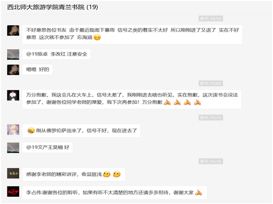 读书分享会期间,有的同学在南国酷暑中,有的同学在陇南暴雨洪灾中,有的同学在火车上,但阻挡不了同学们喜欢读书的热情。有的同学受特殊原因影响无奈退出讲座,但他们仍表示了参会的强烈愿望,同时也有很多热爱国学经典的旅院学子在中途加入进来。