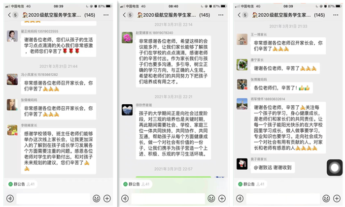 本次会议的召开,旨在建立家校联动的学生管理模式,在学生安全教育、学生身心健康发展、职业生涯规划发展等方面,让学校、班主任、辅导员、任课教师、家长形成五级联动,共同培育高质量的民航服务与管理的人才。此次线上家长会的顺利召开在家长中引起强烈反响,加深了家长对学校学院和专业的认知,会后纷纷对学院及时有效的组织会议表示感谢。学院未来也会将线上方式召开家长会常规化进行。
