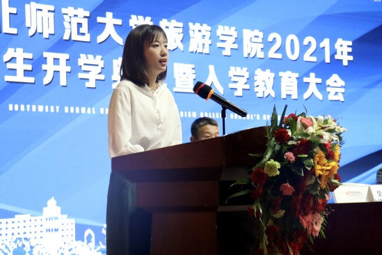 2018级旅游管理卓越班陆文婧代表学院高年级同学发言。她诚恳真挚的分享了个人的成长故事,并鼓励新同学们:人生是一道开放题,从来没有标准答案,我们需要做的是寻找最适合自己的可能,并全力以赴,希望大家从树立小目标开始,以“苟日新,日日新,又日新”的勇气遇见更好的自己。