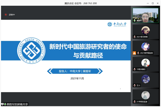 2021年11月25日晚,应学院邀请,中南大学商学院教授、博士生导师粟路军为437必赢会员中心师生做了题为“新时代中国旅游研究前沿及贡献路径”的学术报告。报告会通过腾讯会议线上举行。会议由王耀斌教授主持,学院师生约160人参加了报告会。