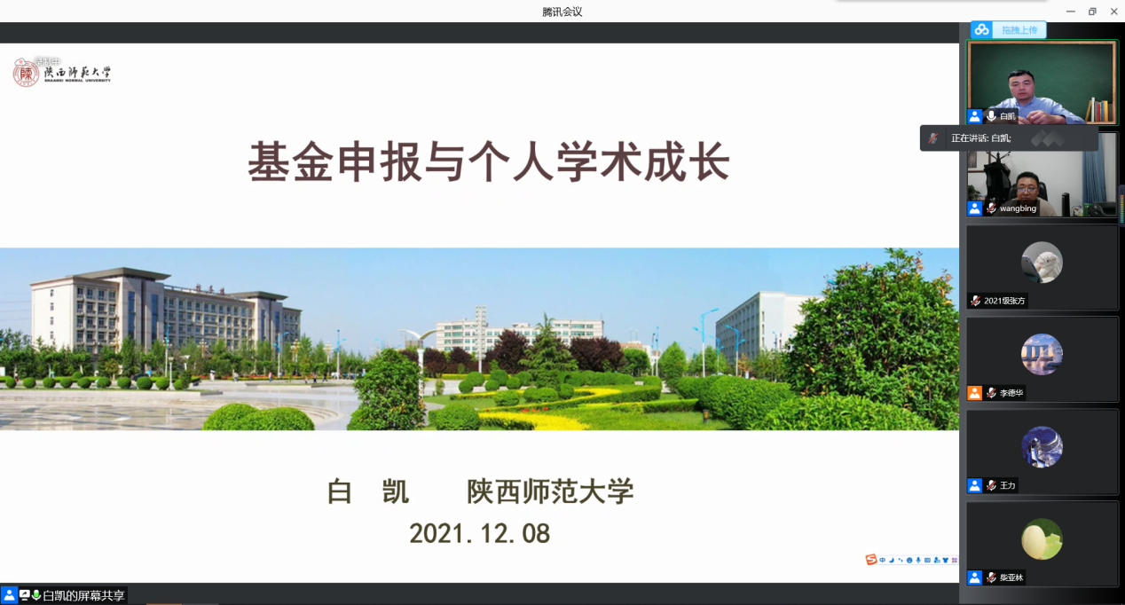 2021年12月8日晚,应学院邀请,陕西师范大学地理科学与437必赢会员中心教授、博士生导师白凯教授为必赢官网师生作了题为“基金申报与个人学术成长”的学术报告,报告会由院长梁旺兵教授主持。