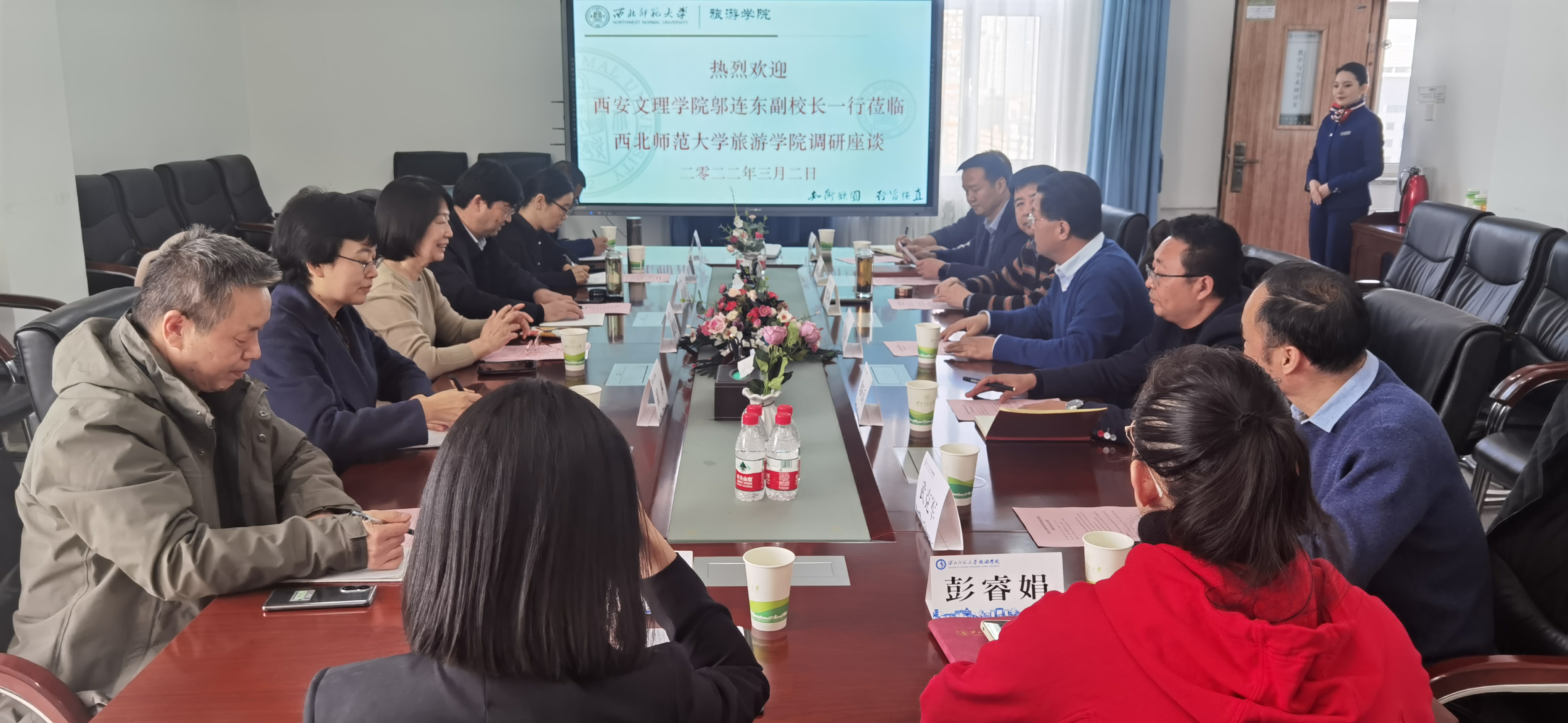 座谈会上,董晨钟副校长代表学校对邬连东副校长一行的到来表示欢迎,并简要介绍了学校办学特色、优势学科、特色专业等情况,希望双方在人才培养、专业建设、学科发展等领域加深交流合作。甘肃省旅游发展研究院执行院长把多勋教授介绍了学院基地平台建设及社会服务情况,阐释并分享了旅游学科高质量发展的新理念、新思路与新经验。院长梁旺兵教授介绍了学院基本情况,表示希望与西安文理学院历史文化437必赢会员中心在本科教学、科学研究等方面进一步展开合作。副院长柴亚林副教授介绍了学院旅游管理专业国家级一流本科专业建设及实验室建设情况。北京广慧金通教育科技有限公司驻必赢线路检测中心工作处主任席聪就学院航空服务艺术与管理专业历年招生就业、学生职业发展等情况进行了说明。