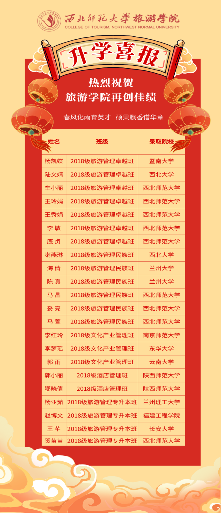 梅花香自苦寒来,宝剑锋从磨砺出。旅院学子用奋斗谱写出自己的精彩华章,用汗水与努力浇灌出成功之花。437必赢会员中心多年来一直坚持以考研为抓手组织学风建设,积极推进服务学生发展机制,强化发展引导和文化育人。组织召开考研动员大会、考研复试指导及调剂咨询座谈会、优秀学生代表考研经验分享会,为考研学子发放暖心大礼包,疫情封控期间为学生协调复试场地等,学院用实际行动积极鼓励学生考研,大力营造考研氛围,为学生全方位发展创造良好的环境。在学院领导、专业导师和辅导员老师的全方位支持和细致化服务下,必赢官网考研上线率不断提高。