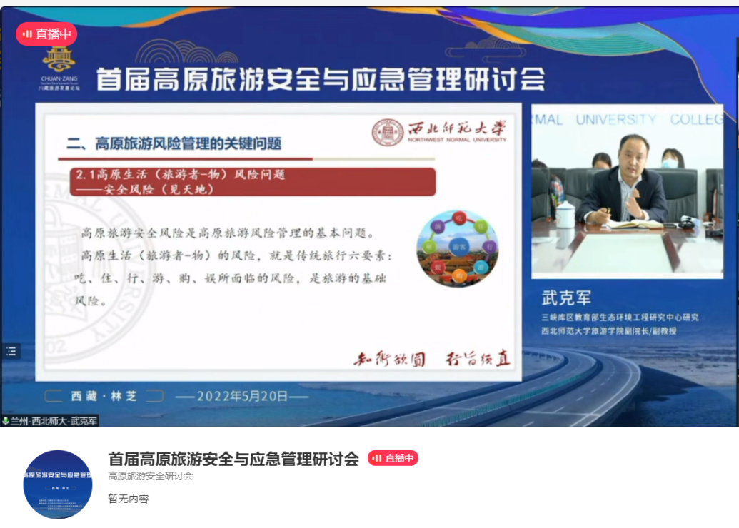 武克军博士在学院1101会议室在线围绕高原旅游风险管理的内涵特征、关键问题和对策建议做主题发言。武克军博士分别从高原旅游风险管理的内涵特征、高原旅游风险管理的关键问题、高原旅游风险管理的对策建议三个方面对会议主题发表自己的看法,认为高原旅游风险特征决定了高原旅游风险管理的关键问题,因此高原旅游需要处理好高原与生活、学习和成长之间的关系,同时就问题的解决提出自己的意见和看法。