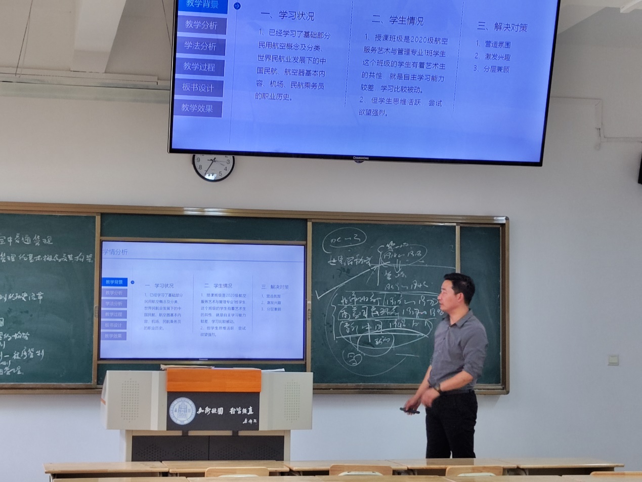 2022年5月26日下午,第七届青年教师教学大赛院级初赛暨437必赢会员中心第八届青年教师教学创新大赛的第十四场比赛在教学10号楼A区308教室如期举行。学院航空服务艺术与管理系主任万抒佳、专业实习中心主任陈娟娟、北京广慧金通教育科技有限公司驻必赢线路检测中心工作站主任席聪以及白秀显老师、殷玥老师、宋泽老师等6位教师观摩了邹小强老师为航空服务艺术与管理专业本科生讲授的《民航概论》课程。