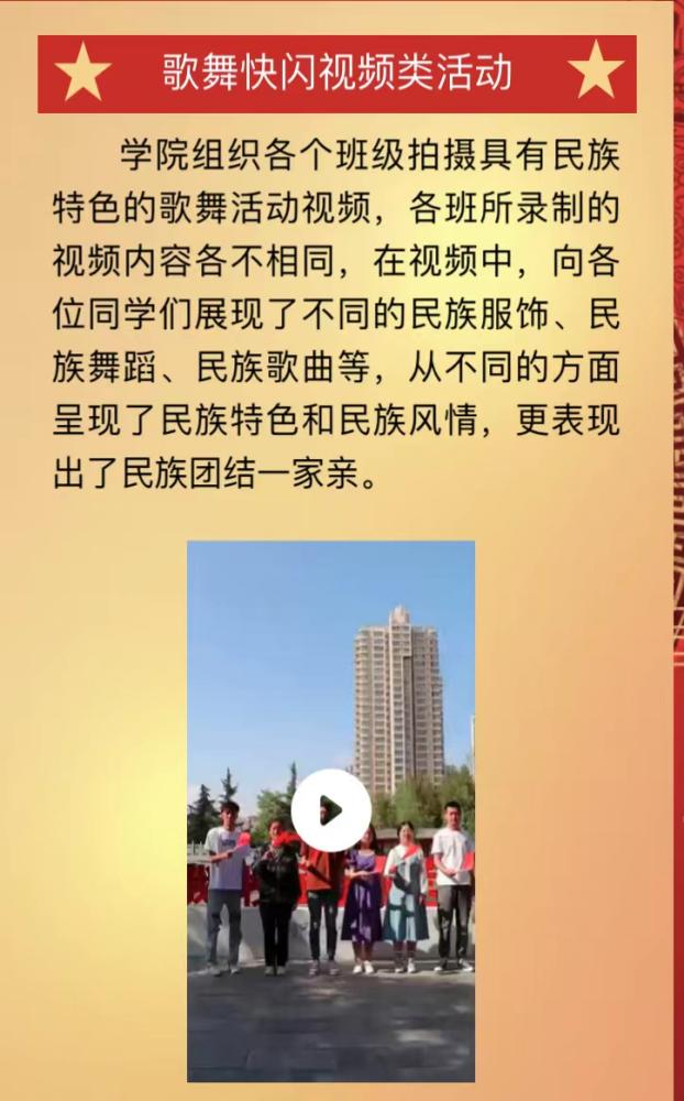 5月7日至5月15日,437必赢会员中心团委号召2019级、2020级、2021级班级积极参加快闪歌舞活动。各班级围绕中华民族大团结、中华民族共同体等方面,以“铸牢中华民族共同体意识,喜迎党的二十大胜利召开”为主题,并结合习近平总书记的重要讲话精神,用视频形式为同学们展现民族团结的重要性。