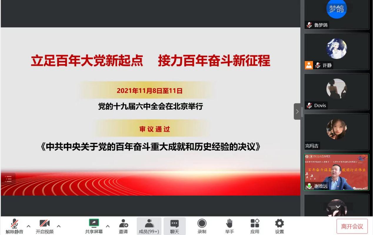 谢致远从“镌刻史册的伟大飞跃 不可逆转的复兴进程”、“气象万千的伟大时代 浓墨重彩的崭新篇章”、“永葆初心的大党内容担当 伟大光荣的历史贡献”、“弥足珍贵的精神财富 开创未来的行动指南”四个部分深入浅出,引述生动案例与时事,全方面的回顾了我党百年的辉煌历程。通过对当前国际形势的深入分析,深刻揭示了中国共产党从胜利走向胜利的内在历史逻辑,教育大家增加对中国特色社会主义的信心,增强实现中华民族伟大复兴的斗志,激励大家传承百折不挠、自力更生、锐意进取、自信自强的伟大精神。