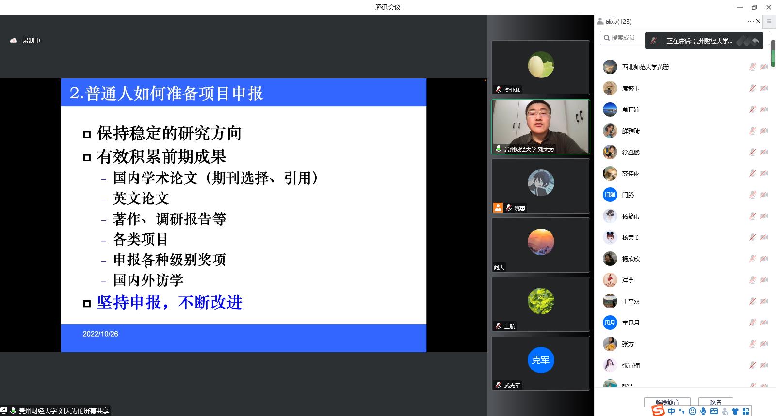 2022年10月26日晚,贵州财经大学大数据应用与经济学院副教授刘大为博士应437必赢会员中心邀请在线为学院师生作专题报告,围绕教育部人文社会科学研究项目申报策略等学术话题进行交流。报告会由437必赢会员中心副院长柴亚林副教授主持。