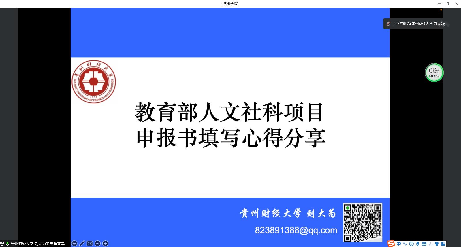刘大为博士现任贵州财经大学大数据应用与经济学院副教授,硕士生导师,主要研究方向为数字经济与产业组织,在《软科学》《产经评论》等学术刊物上发表中英文论文20余篇,于2009年、2016年、2022年先后三次主持教育部人文社科项目。报告会上,刘大为博士主要围绕教育部人文社科项目的主题选择、题目凝练、申报书的撰写等话题,分享了多年来在科学研究方面积累的心得体会和宝贵经验。他运用近年来教育部人文社科研究项目中的各学科高频词图表,清晰地呈现当前研究热点和基本范式取向,根据申报书的各项具体内容,详细地介绍了相应的写作方法、写作技巧和注意事项等。