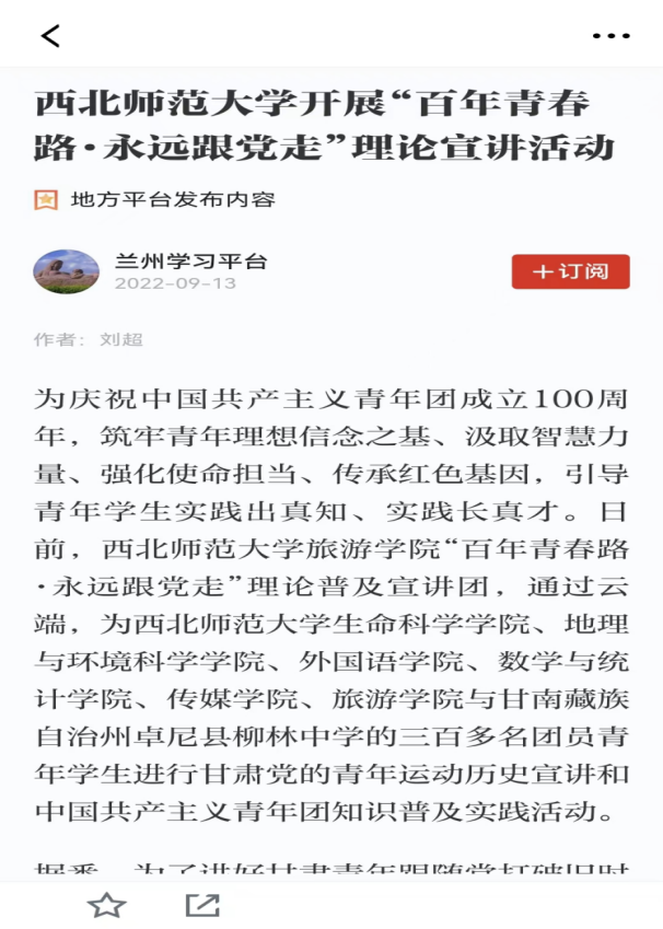 此次宣讲活动主题鲜明、思想深刻、内容丰富,整理形成了图文并茂、丰富详尽的《甘肃党的青年运动历史讲解词汇编》、《甘肃党的青年运动历史大事记》,有效帮助广大团员青年加深对红色革命历史的学习和领悟,在广大团员青年中影响深、效果好,获得了社会各界热烈反响,先后在中宣部“学习强国”平台、兰州日报等各大媒体平台宣传报道。