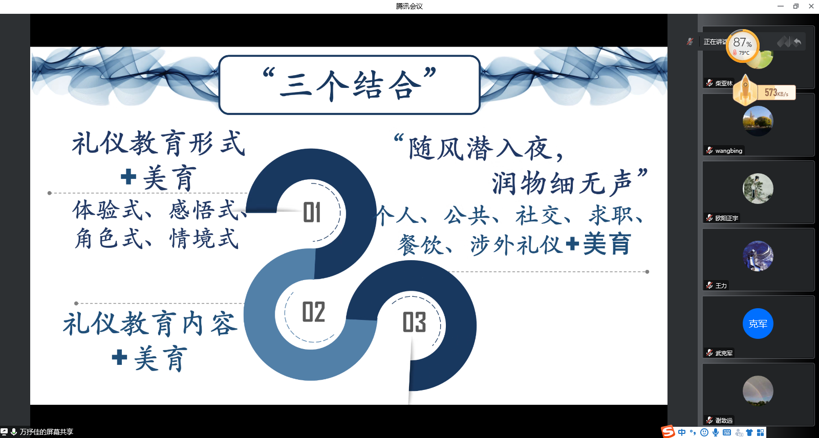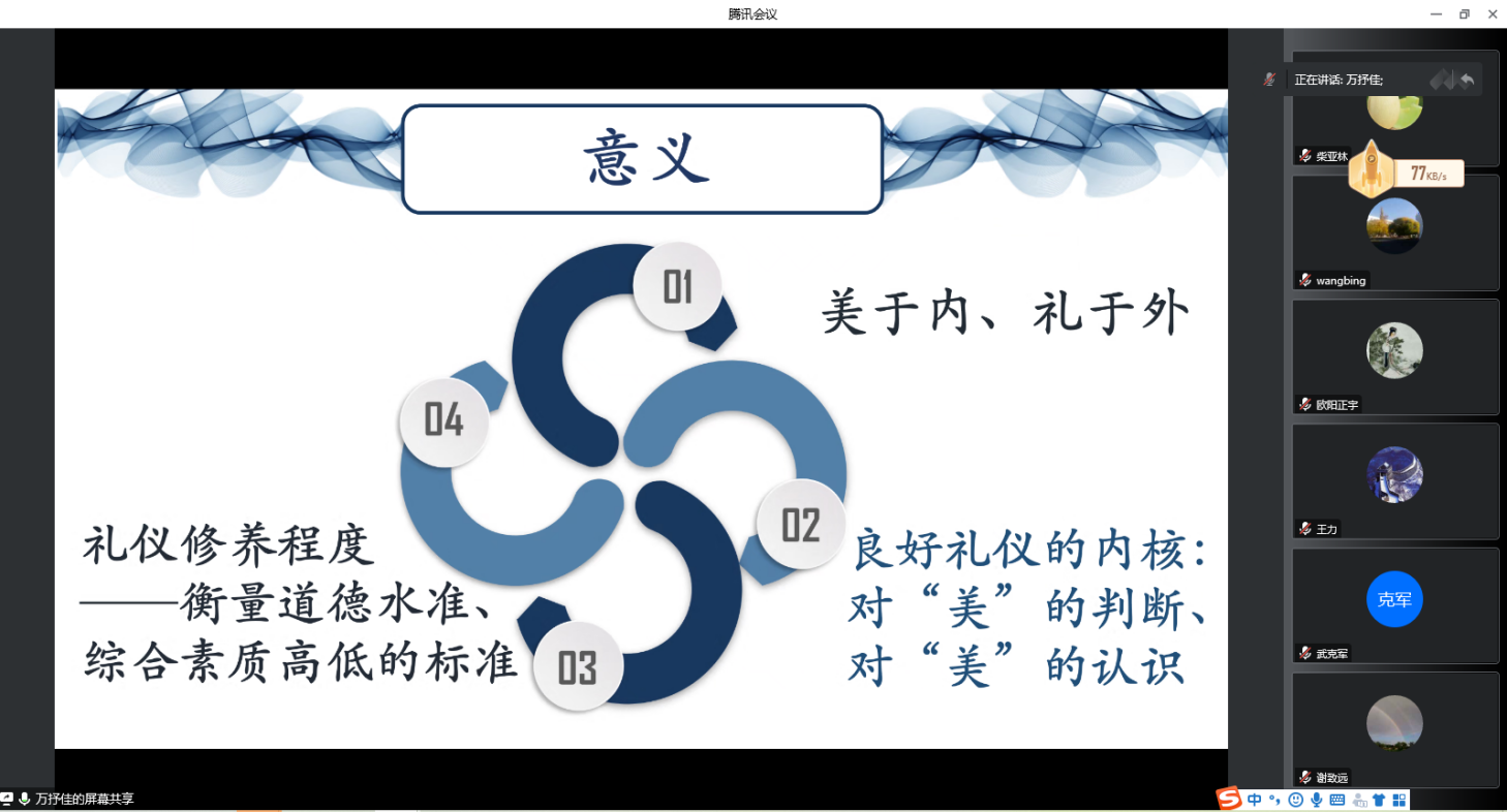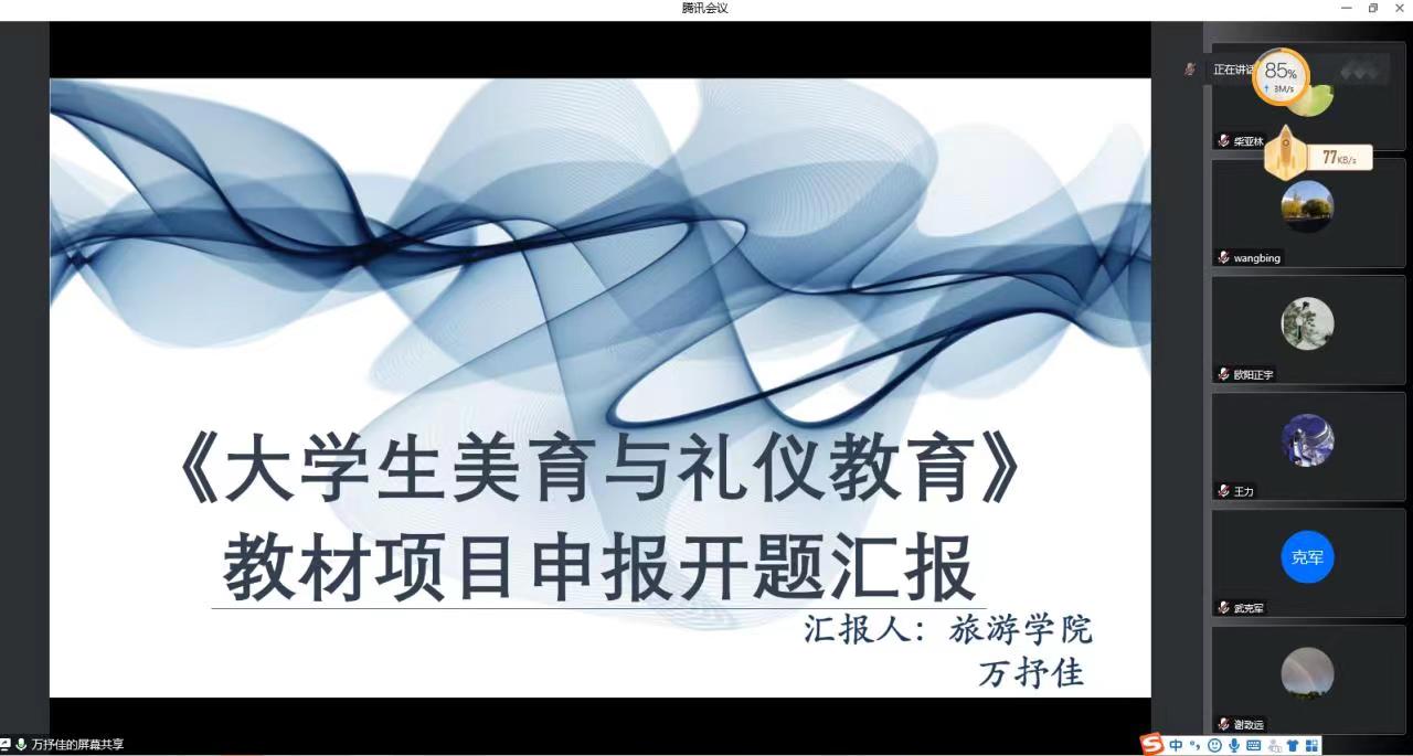 会议开始,万抒佳副教授对该教材的编著背景、目的及意义、教材大纲以及创新和特色做了全面的介绍汇报。该教材尝试通过以大学生为主体的礼仪实践,增强大学生的道德素养、审美意识和礼仪的人文美、理性美,把美育的形象性、情感性、愉悦性、趣味性应用于礼仪教育当中,使礼仪教育更加生动形象,更具亲和力和感染力,使当代大学生在实践中懂得敬人、自律,从而提高礼仪教育的时效性,更好的指导大学生的未来生活。