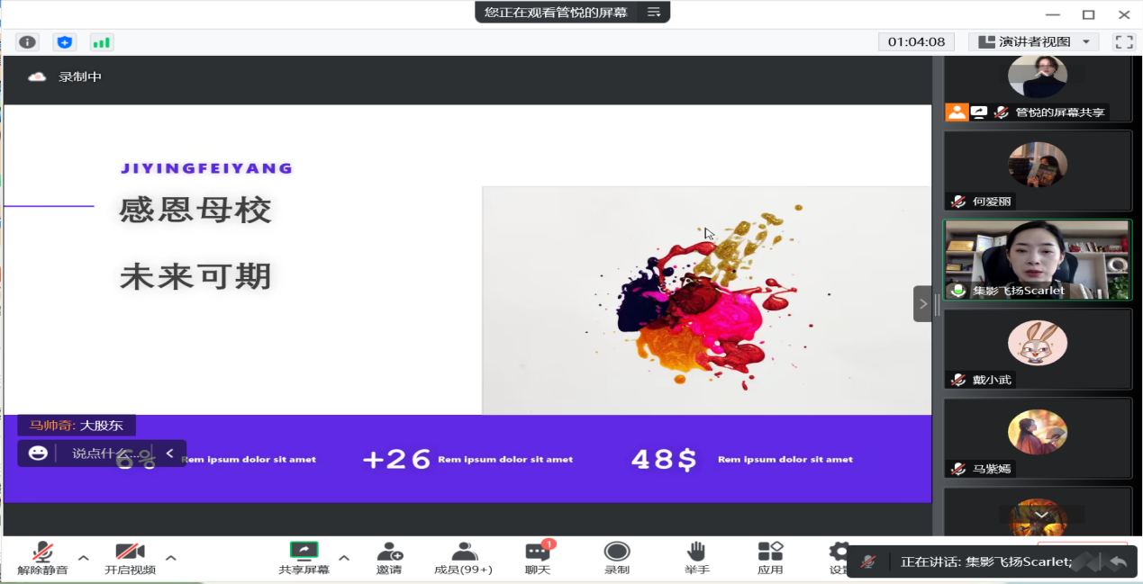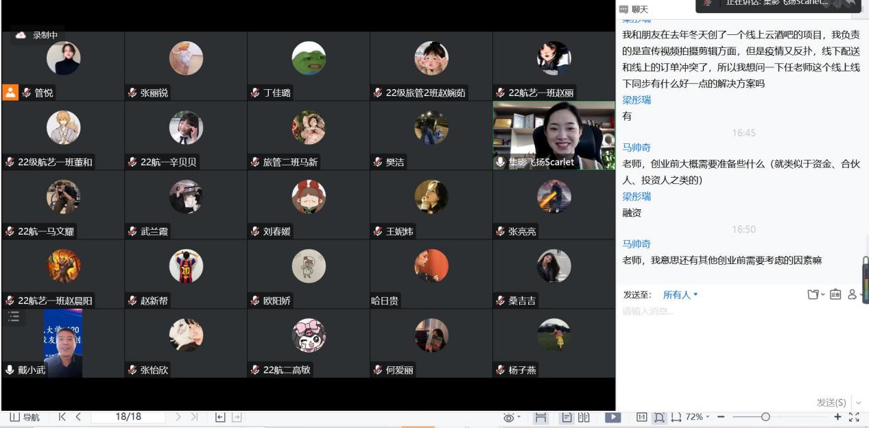 与会同学们积极互动,踊跃发言。任江校友就同学们的问题进行了细致的解答,同时也鼓励同学们如果决定创业就要坚持下去。她寄语同学们:“在自己的世界里独善其身,在别人的世界里顺应自然”。