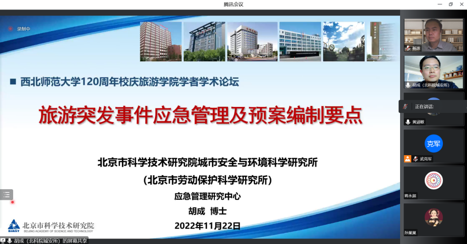 2022年11月22日,必赢线路检测中心120周年校庆437必赢会员中心学者学术论坛系列活动,由北京市科学技术研究院城环所胡成博士向师大师生做题为《旅游突发事件应急管理及预案编制要点》的专题报告。会议报告由437必赢会员中心杨波副教授主持,参会师生共计300余人。