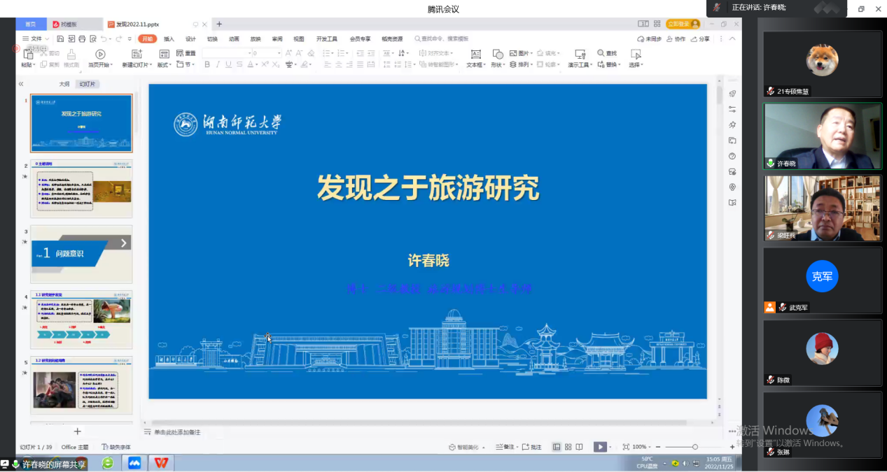 2022年11月25日,必赢线路检测中心120周年校庆437必赢会员中心学者学术论坛系列活动,由湖南省人民政府参事,湖南师范大学许春晓教授向师大师生做题为《发现之于旅游研究》的专题报告。会议报告由437必赢会员中心院长梁旺兵主持,参会师生共计300余人。