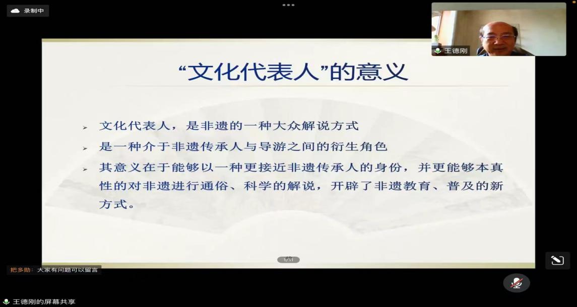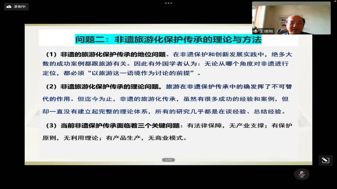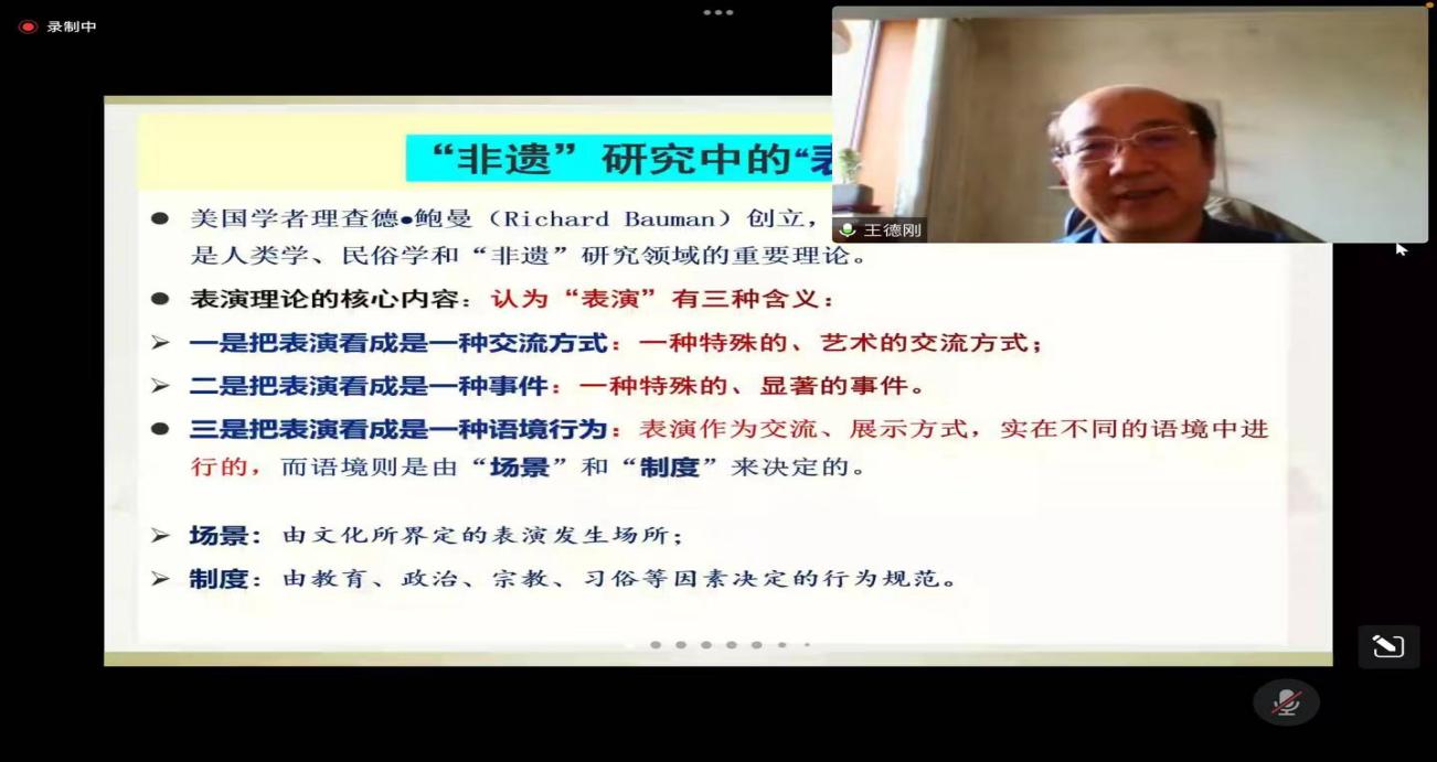 王教授以表演理论作为切入口,提出了在文旅融合背景下非物质文化遗产保护传承与创新发展模式中自己的观点和看法。首先,王教授结合“表演”理论的三种含义,提到表演理论的核心观点是由“向后看”到“向前看”,倡导不要总是强调“非遗”过去是什么,更重要的是应该关注未来是什么。