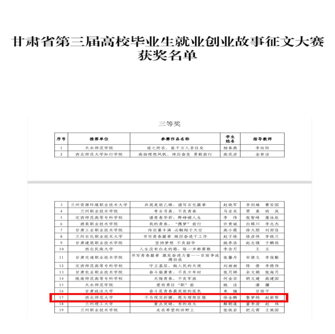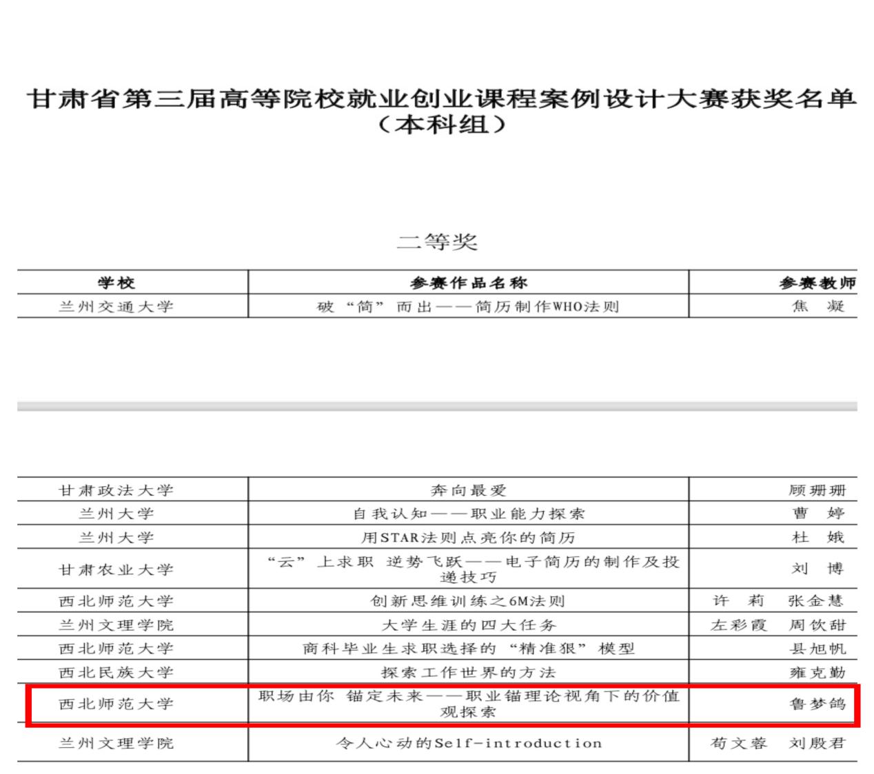 前期经过学院审核复选、学校决赛推荐层层选拔,甘肃省第三届高等院校就业创业课程案例设计大赛中必赢官网专职辅导员老师鲁梦鸽的作品《职场由你 锚定未来—职业锚理论视角下的价值观探索》获本科组二等奖,甘肃省第三届高校毕业生就业创业故事征文大赛中必赢官网18级毕业生徐金鹏同学的作品《不为现实折腰,愿为理想臣服》获三等奖。