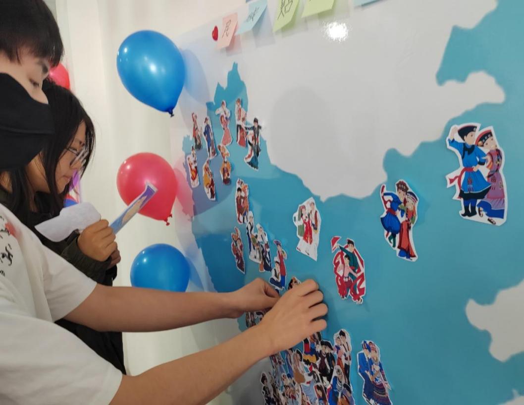“千枝其子,当归中华”民族贴贴乐活动。通过让学生将各民族贴画粘贴在中华人民共和国地图相应位置的形式,让学生们了解各民族的地理分布,营造中华民族一家亲、同心共筑中国梦的良好氛围,展示各民族团结和睦共处、和衷共济、和谐发展的美好景象,增强学生对中华民族的认同。