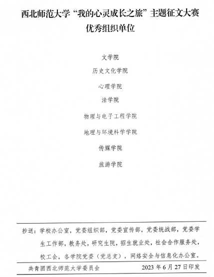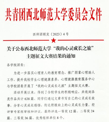 为进一步落实心理育人的教育理念,推广朋辈心理助人工作,提升我校学生心理健康素养,2023年4月15日-5月15日,学校团委与心理健康教育服务中心共同组织“我的心灵成长之旅”主题征文大赛,鼓励同学们书写自己的心灵成长故事,分享心灵成长感悟,传达积极向上的心灵成长力量。