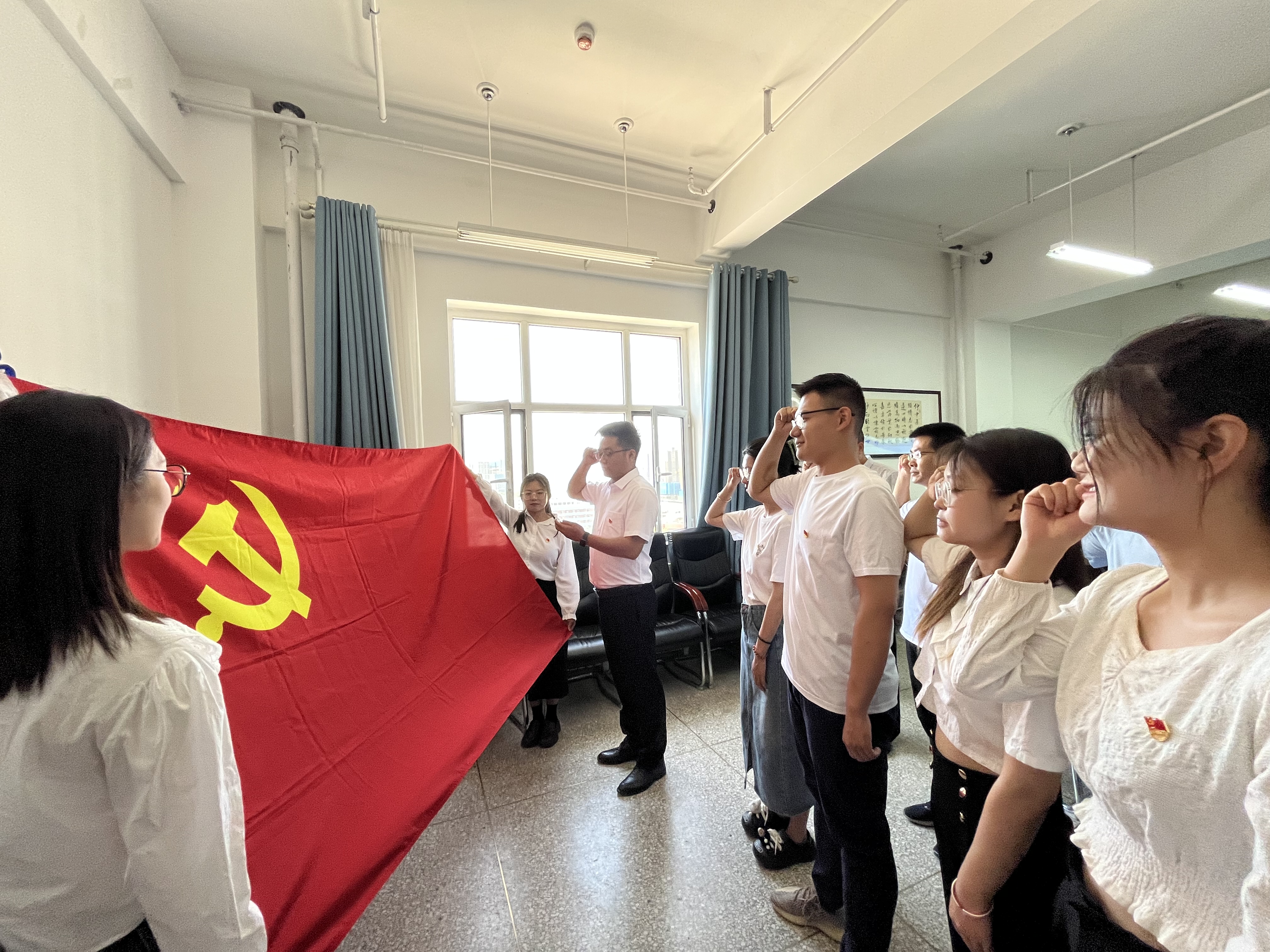 党支部书记为2023年上半年新发展党员佩戴党徽,新发展党员进行了入党宣誓,全体正式党员一起重温入党誓词,大家一起接受政治洗礼,强化党性修养。