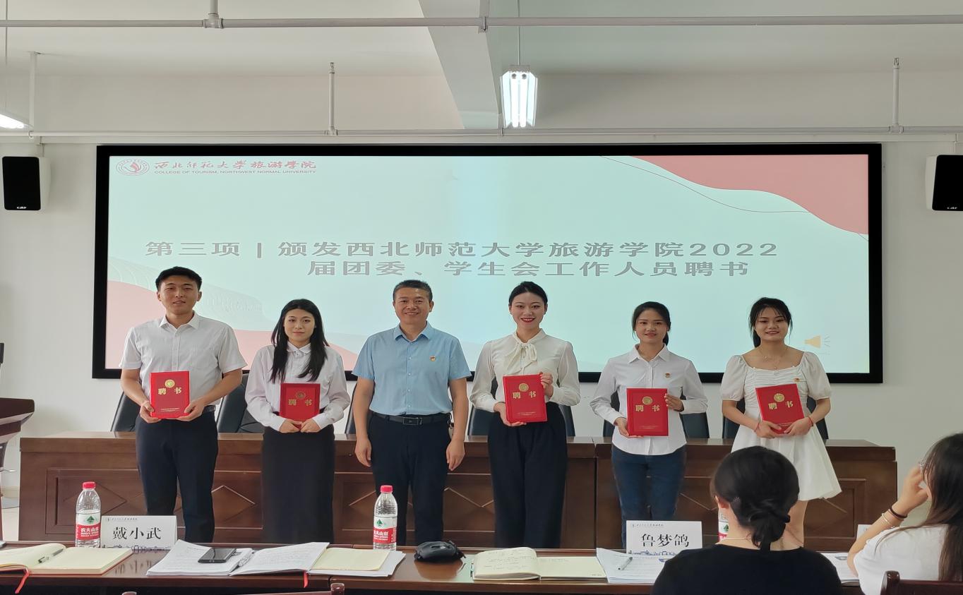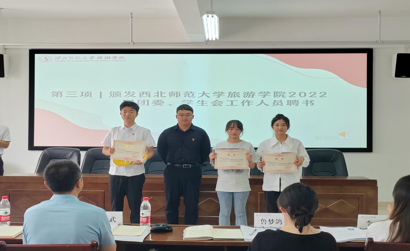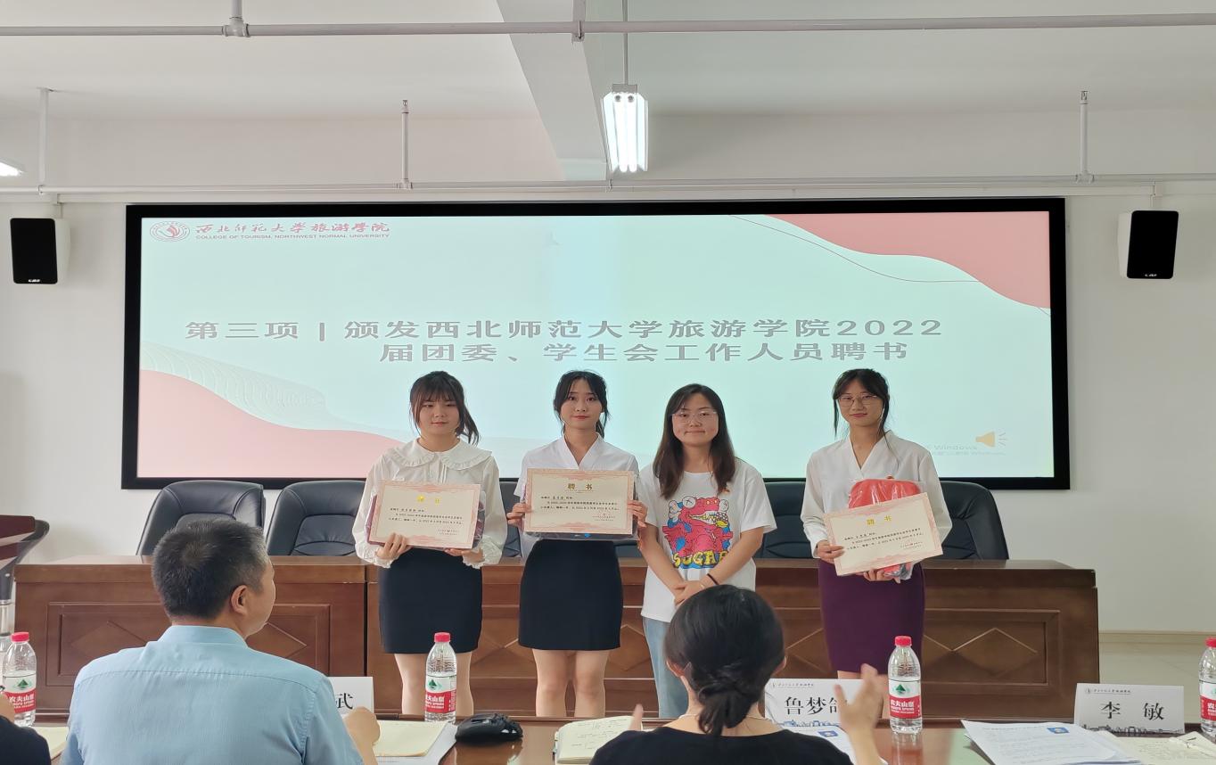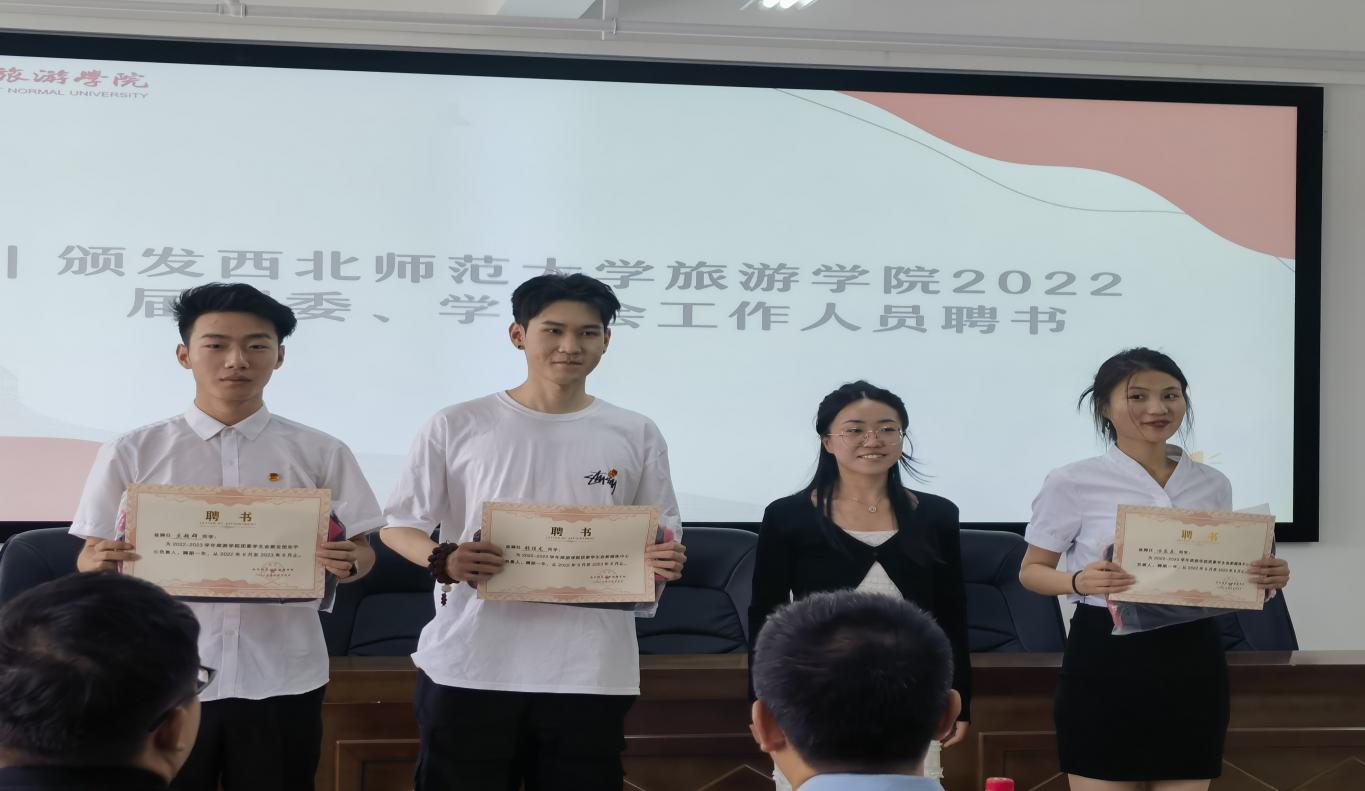 活动现场由王博宣读聘书颁发名单,邀请戴书记与团委老师们分别为2022届团委学生会主席团成员与部室负责人颁发聘书、赠送礼品,并合影留念。