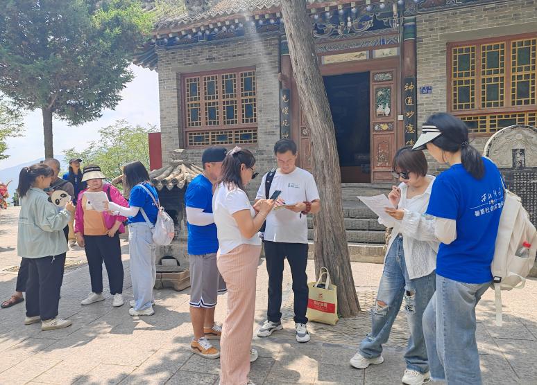 图6 团队师生与太统村管理人员交流研讨 图7 实践团在崆峒山景区开展调研