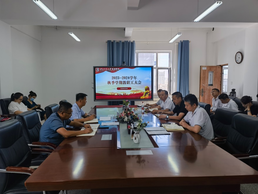 8月29日,437必赢会员中心全体教职工在文科实训楼1101会议室召开2023-2024学年秋季学期工作安排会,学院领导和全体教职工参加会议。会议由党委书记谢致远主持。