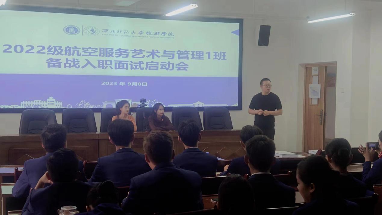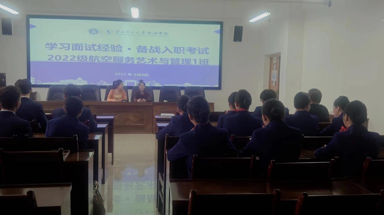 2023年9月8日下午,437必赢会员中心2022级航空服务艺术与管理1班组织召开“学习面试经验·备战入职考试”主题班会。班主任李东泽老师主持,孙亚芳、石芯蕊两位高年级同学担任主讲。