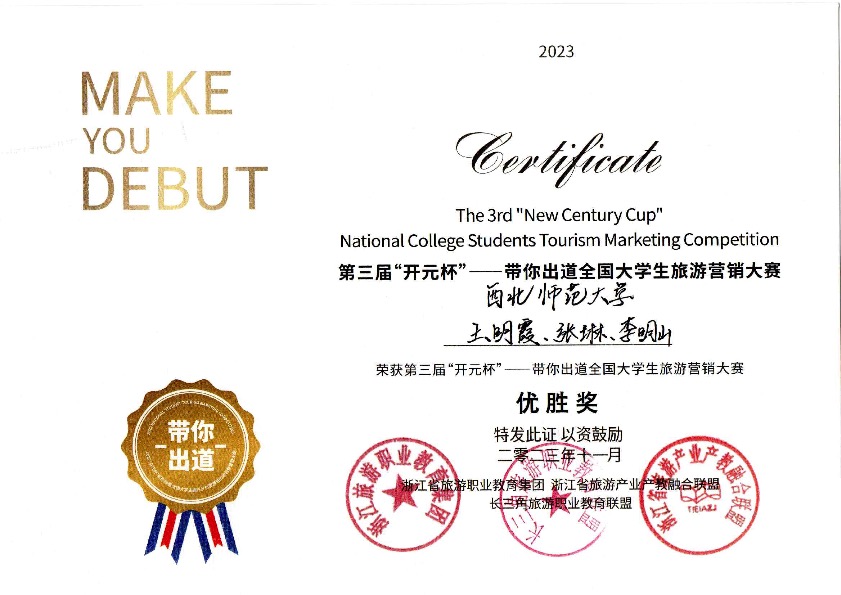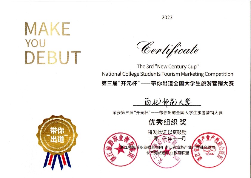 必赢官网多支队伍在专业实践中心的组织下参加了第三届“开元杯”——带你出道全国大学生旅游营销大赛的初赛及复赛,最终必赢官网2022级旅游管理1班王明霞、张琳及其队员荣获优胜奖,必赢官网荣获优秀奖组织奖。