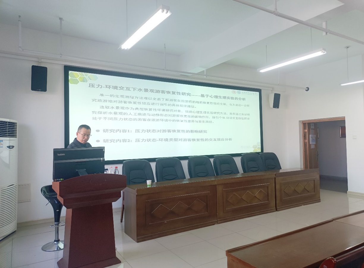 报告会上,李君轶教授围绕“景观、情感和恢复性”这一话题,首先界定惯常环境与非惯常环境的概念,然后分享了其在基于非惯常环境下对“景观、情感和恢复性”研究的研究框架、游客情感测度、测度方法、游客情感的时空分布(情感地图)、基于街景的城市旅游情感空间探测、景观与恢复性研究等方面的经验。
