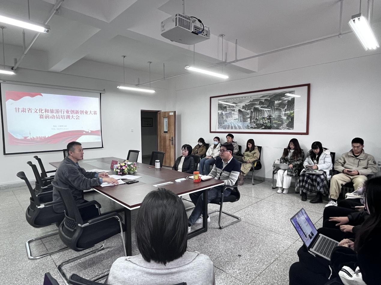 会上,戴小武首先对进入决赛的同学表示祝贺,希望进入决赛的同学以饱满的精神状态迎接比赛,以必胜的信念参加比赛,以认真的态度对待比赛。同时,他针对2023年甘肃省文化和旅游行业创新创业大赛赛事章程进行了详细解读,对赛事主题、路演环节、注意事项、行程安排等方面进行了细致分析,为同学们答疑解惑。