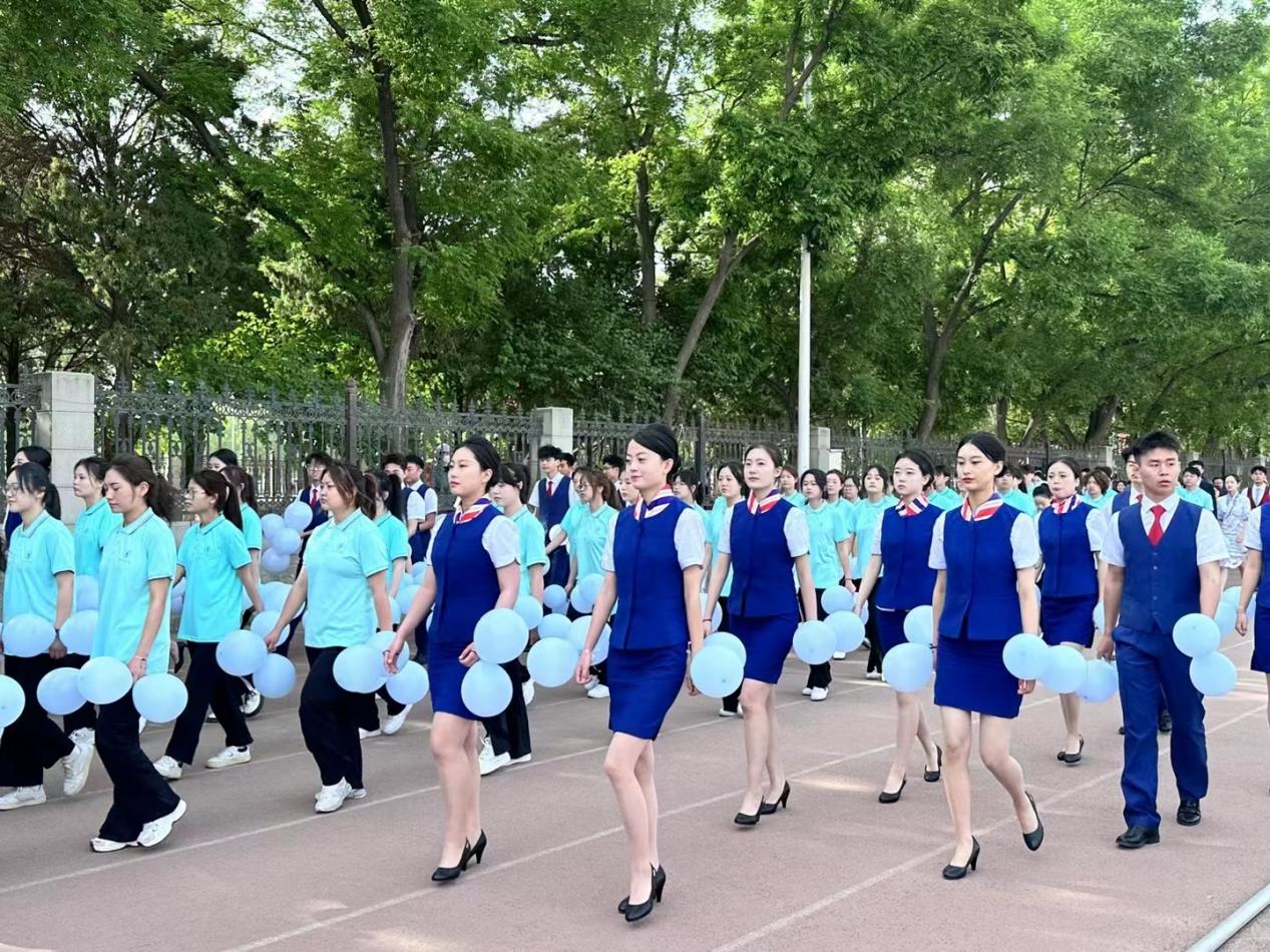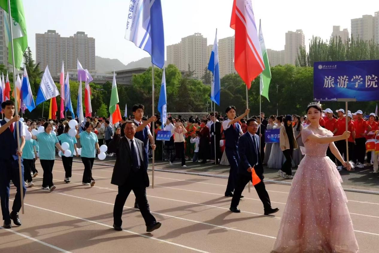 在开幕式中,由101名旅游管理与航空服务艺术与管理专业学子及全体教职工组成的学院方阵以“飞机”为队形,以“团结一心、砥砺前行、旅战旅胜、扬帆起航”为口号,踏步坚实的步伐走过主席台,展示了学院师生积极向上的精神面貌。