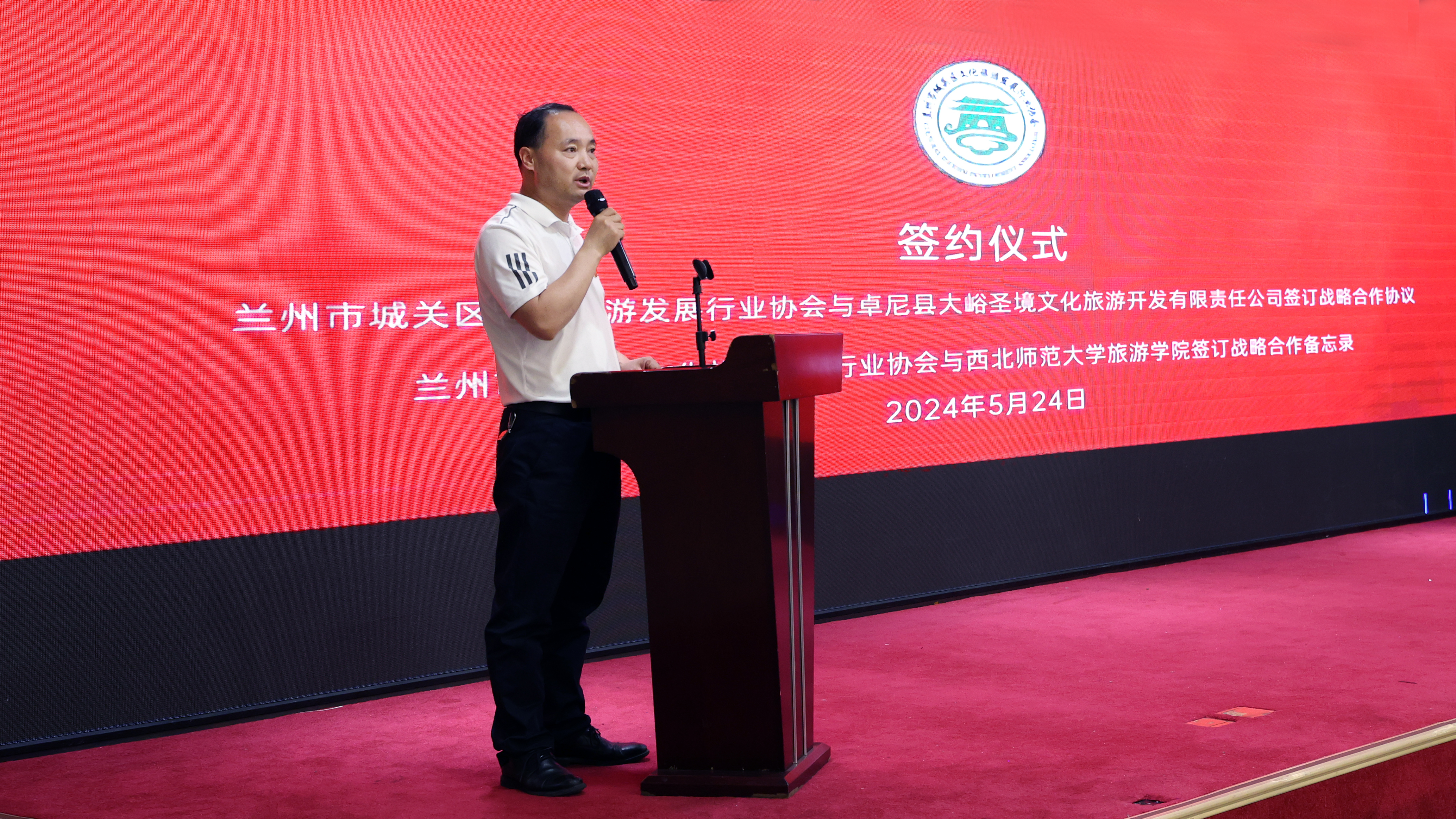 5月24日,《兰州市城关区文化旅游发展行业协会2024年第一届理事扩大会议》在兰州四海宫酒店举行,兰州市文旅局、城关区文体旅游局、城关区旅游服务管理中心领导、协会理事以上单位代表、特邀嘉宾、协会专家、省内外重点文旅集团等160余人参会。必赢官网武克军副院长代表学院参加签订仪式并发言。