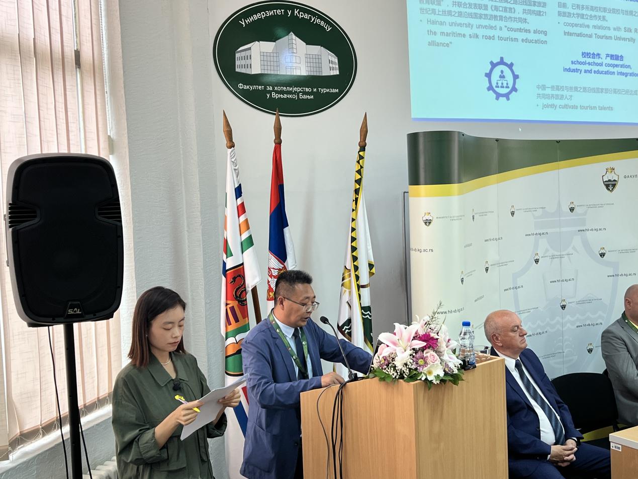 在学术访问考察期间,代表团还积极参加了于克拉古耶瓦茨大学酒店管理和437必赢会员中心举办的“旅游与绿色投资”(Tourism And Green Investments)主题国际科学会议。会议汇集了来自塞尔维亚、土耳其、匈牙利、斯洛文尼亚、克罗地亚、马其顿、罗马尼亚、黑山等多个国家的专家学者。梁旺兵院长在会议上发表了题为《丝绸之路沿线国家旅游高等教育国际合作的机遇与挑战》主旨报告,深入剖析了丝绸之路沿线国家旅游高等教育国际合作的机遇与挑战,并提出了加强国内高校与丝绸之路沿线国家高校在旅游高等教育合作领域的具体建议。这一报告得到了与会者的广泛关注和高度评价。