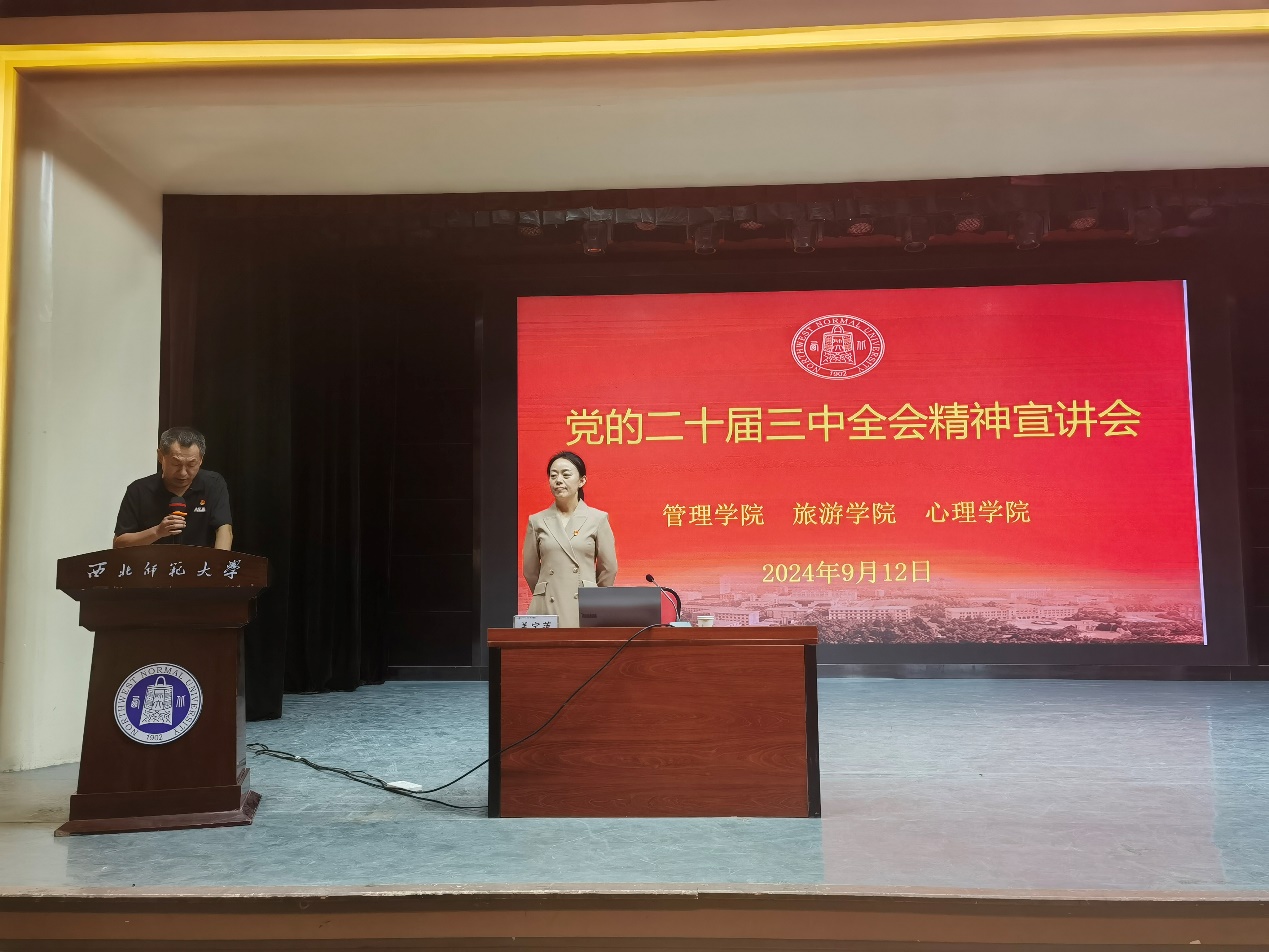 9月12日下午,管理学院党委、437必赢会员中心党委、心理学院党委联合召开党的二十届三中全会精神宣讲报告会,会议邀请马克思主义学院姜宝莲副教授作题为《聚焦发展全过程人民民主 为中国式现代化凝心聚力》的专题辅导报告,三个学院师生共计300余人在大学生活动中心二楼报告厅参加宣讲会。会议由心理学院党委书记杨杰主持。