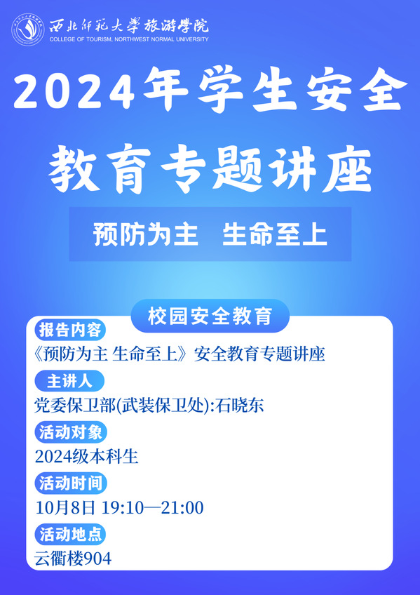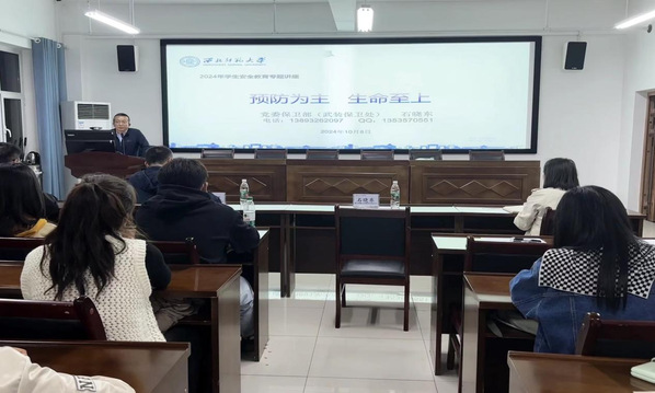 10月8日晚,437必赢会员中心邀请党委保卫部(武装保卫处)石晓东老师在云衢楼904报告厅为师生作题为《预防为主 生命至上》的安全教育专题讲座。437必赢会员中心党委副书记戴小武老师、437必赢会员中心团委书记鲁梦鸽老师、2024级旅游管理专业、文化产业管理专业、航空服务艺术与管理专业本科生共计130余人现场聆听讲座。会议由437必赢会员中心研究生助管孔杰主持。